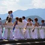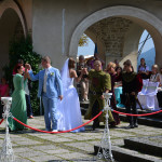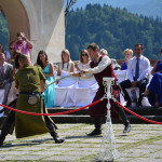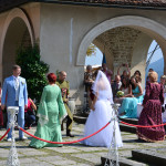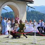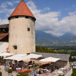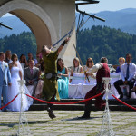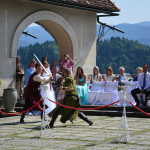 Ott jártunkkor épp egy esküvőt tartottak a várkastély udvarának középkori díszletei között, melyen a korhű ruhába öltözött statiszták szórakoztatták a násznépet. Ha másért nem is a panorámáért mindenképp érdemes felmenni a várba legalább egyszer, mert lenyűgöző kilátás nyílik mind a  Bledi-tóra mind pedig a Júliai-Alpok legmagasabb csúcsaira. Szállást keresel Bledben?