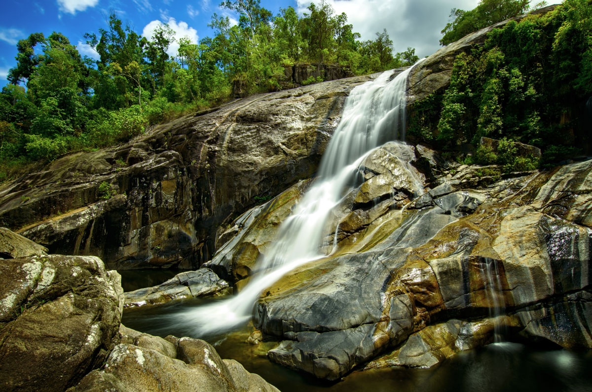 Airlie Beach felé indulva tettünk egy kis kitérőt a Murray Fallshoz. Ez a vízesés a Girramay Nemzeti Park része és szintén rajta van a Világörökségi listán. Az autópályáról letérve, egy félórás kitérővel érjük el a hatalmas parkolót, ahol néhányan kempingeznek is lakókocsival. A vízesés nagyon szép és a kiépített platformról szemből meg is csodálható, ahogy 20-30 méter magasból alábukik a zuhatag. Tanösvények is vannak a környéken, így az egész vízesés körbejárható.