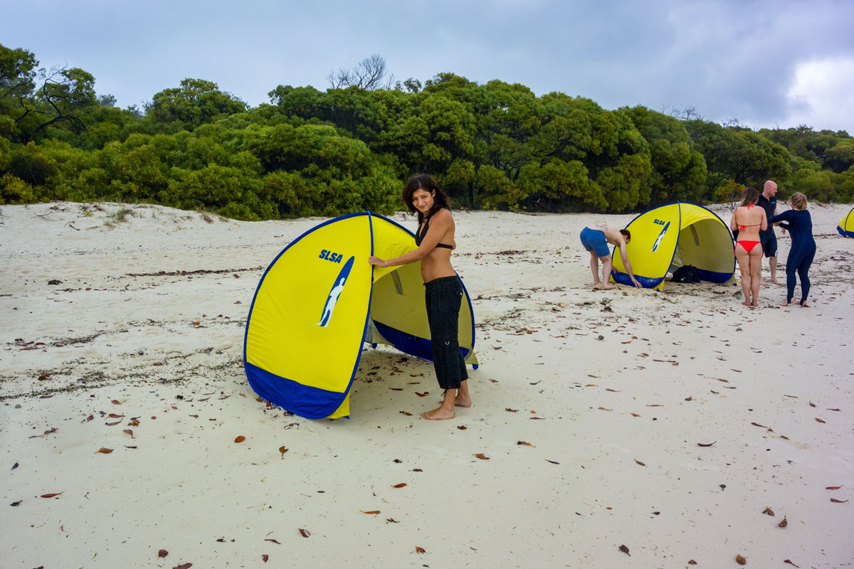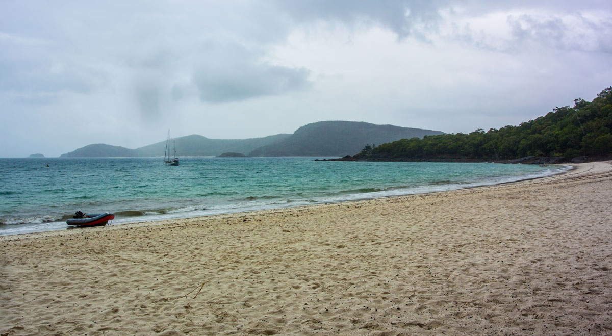 Nem túl trópusi paradicsomi körülmények között, ahogy az ember elképzeli, szeretné. Kis tengeribetegséget sikerült is összeszedni a hajón, ráadásul ennyire rossz időre mi sem készültünk, úgyhogy kicsit alul is voltunk öltözve. Sajnos ilyen időben a Whiteheaven Beach sem az a képeslapra illő világelső tengerpart. De azért sétálunk egyet és próbáltuk elképzelni, milyen is lehet ragyogó napsütésben.