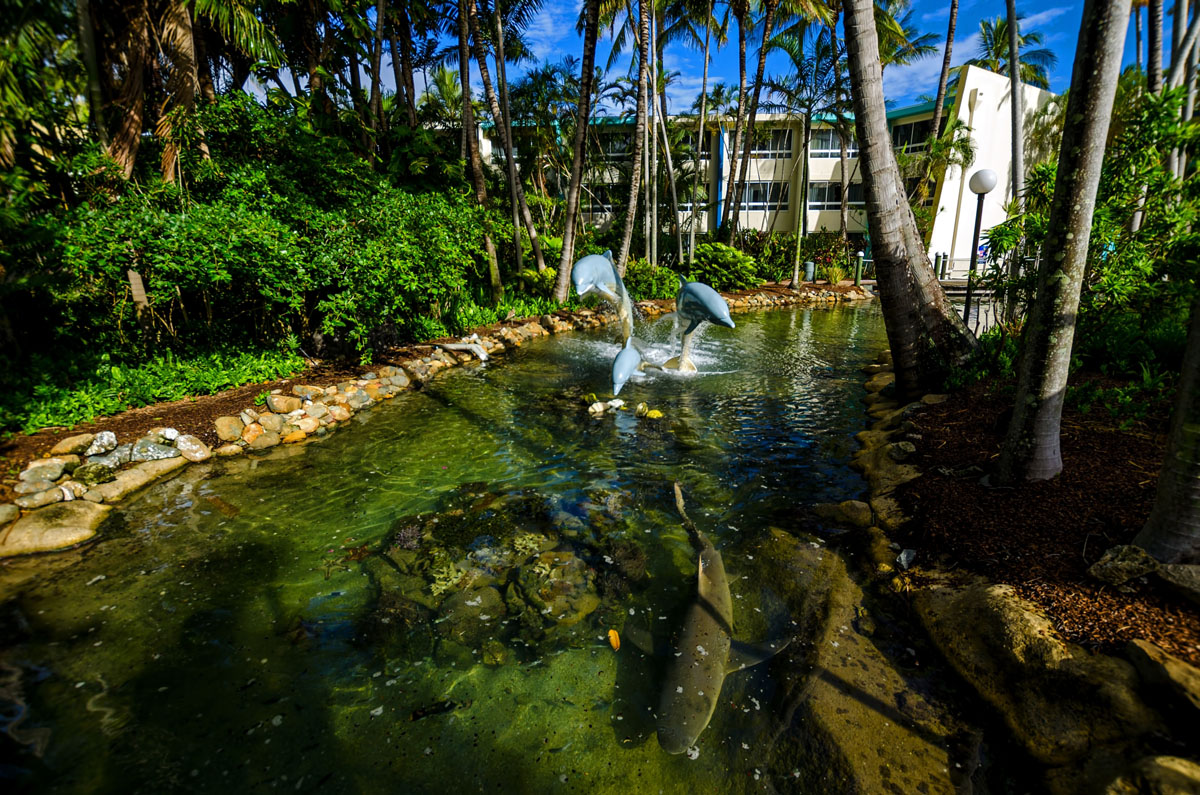 Később, a délután folyamán, mire a Daydream szigetre értünk, az esőfelhők kicsit feloszlottak és kisütött a nap. A kis szigetet könnyű volt körbesétálni, egy látványos hotelkomplexum van rajta néhány medencével, ahol meg lehet mártózni, egy kellemes délutáni programként mi meg is mártóztunk.