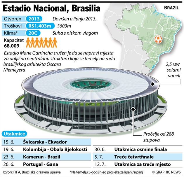 Az Estádio Nacional de Brasília, közismertebb nevén a Mané Garrincha, 1974. március 10-én nyitotta meg kapuit. A 2010 óta tartó felújítása után az eredeti 42 200 néző befogadására alkalmas stadiont
