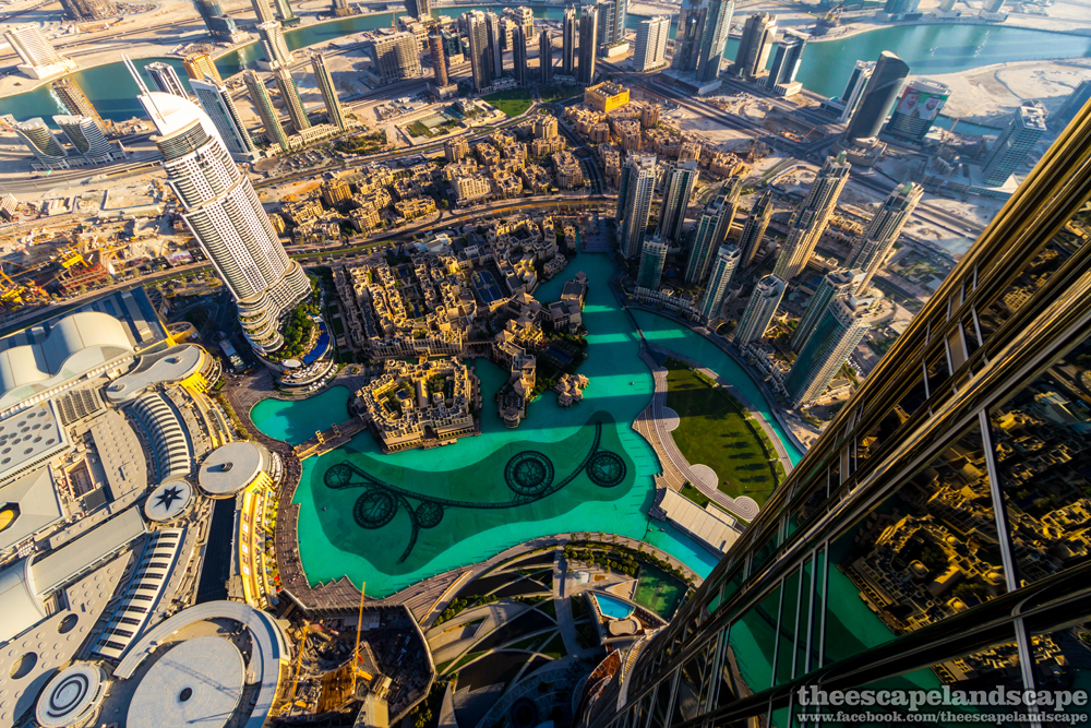 A Burj Khalifa óriási árnyéka. A torony (a Burj egyébként arabul tornyot jelent) 828,9 méter magas és a tetején hat fokkal van hidegebb, mint a földszinten.