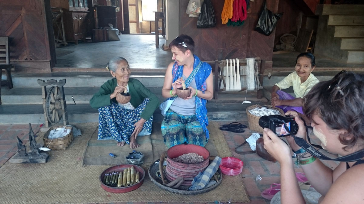 Belsejében négy óriási arany Buddha tekint a négy égtáj felé és belül, a körfolyosók mentén számtalan felbecsülhetetlen értékű kisebb Buddha szobor őrzi a hely békéjét. Még végigcsodáltunk néhány templomot azzal az érzéssel a szívünkben, hogy örökre itt tudnánk maradni az összes templomot felfedezni. Az egyik templom előtt két kislány ült egy robogón és hibátlan angolsággal megkérdezték, hogy meglátogatjuk-e a kézműves falujukat nem messze. Nem sok kedvünk volt esetleg belekerülni egy turistaátverős szituációba, de annyira kedvesek voltak, hogy végül igent mondtunk.
