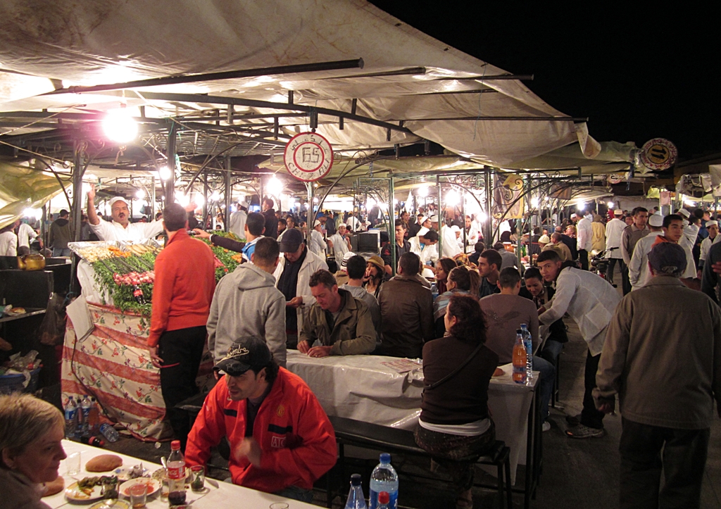 Maga a főtér már nem olyan varázslatos, mint amire az útikönyvek alapján számítottunk, mivel megpróbálják a helyi erők „kényesturista” baráttá tenni a várost, így már szigorúan ki vannak osztva a sátorhelyek, a régebbi poros talajt felváltotta a térkő, egészségügyi ellenőrzések vannak, így inkább az 1001 éjszaka XXI. századba ültetett remakejének tűnik az egész, mint az eredeti műnek (második európai nyom).