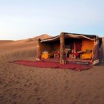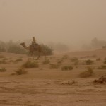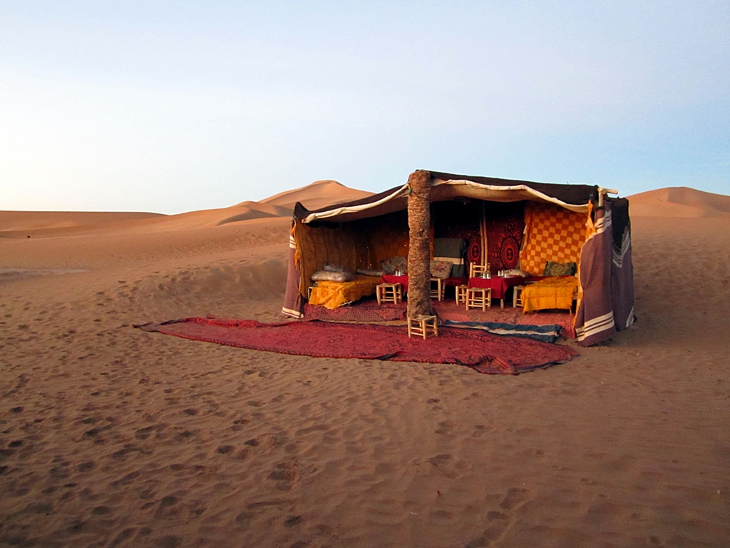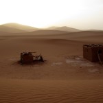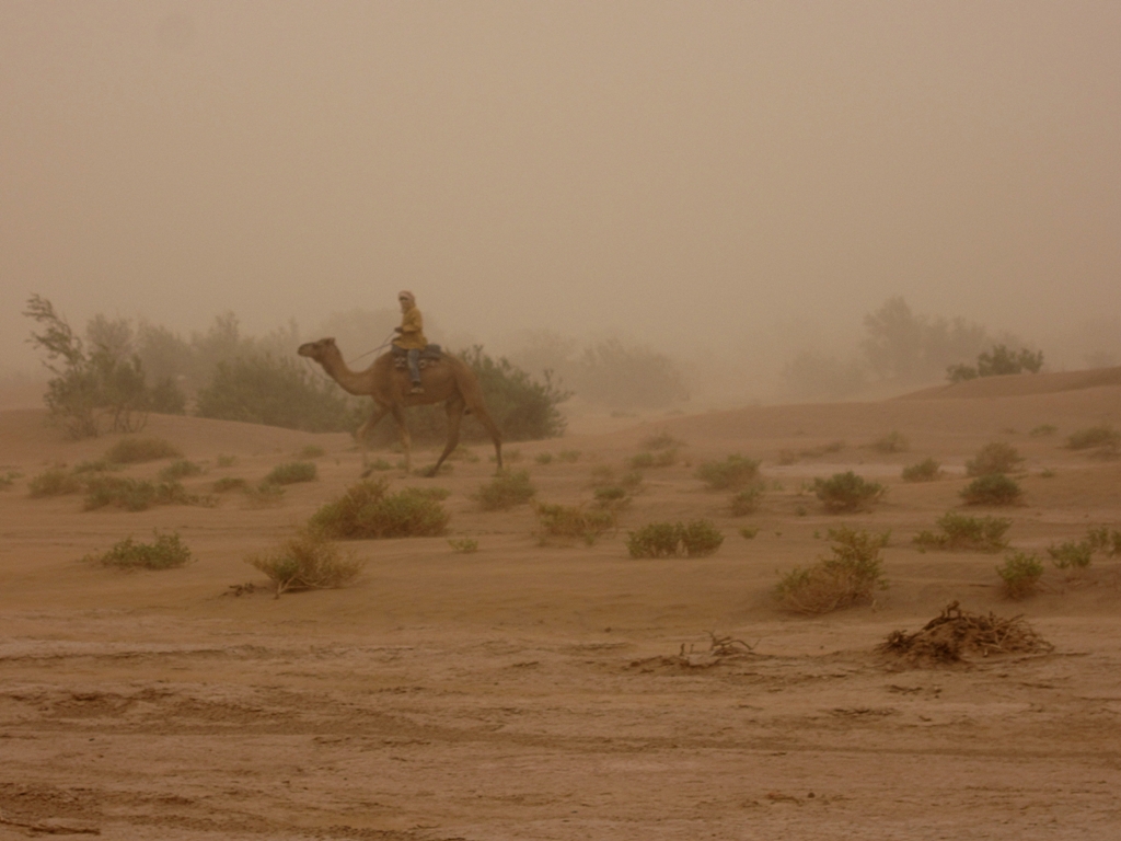 Látszott a sofőrön az évek és a rutin, mivel villámként suhantunk a sivatagban, egy homokvihar közepén, és egyszer sem tűnt úgy, hogy kétségbe lenne esve, mert eltévedtünk. Másfél óra utazás után érkeztünk meg egy táborhoz, és amíg készült a vacsoránk, addig elindultunk egy kicsit felfedezni a környéket, de messzire nem jutottunk, mert egyre erősebben fújta a homokot a szemünkbe a szél, így azzal nyugtáztuk a dolgot, hogy remélhetőleg reggel majd szerencsésebbek leszünk.