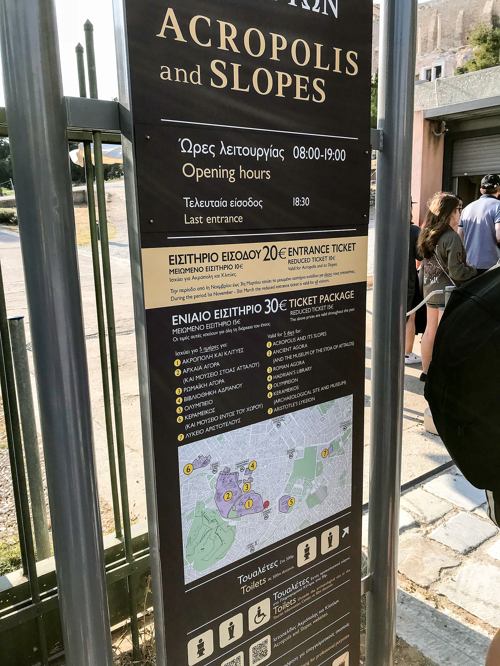Ha szeretnénk végigjárni a leghíresebb ókori látnivalókat, akkor mindenképpen a 30 euróba kerülő kombinált jegyet vásároljuk meg, amivel az Akropoliszon kívül további 6 ókori látnivalót járhatunk be. A jegyet az Akropolisz lábánál lévő pénztárak egyikében bármikor megvehetjük, ami a vásárlástól számított 5 napig érvényes.
