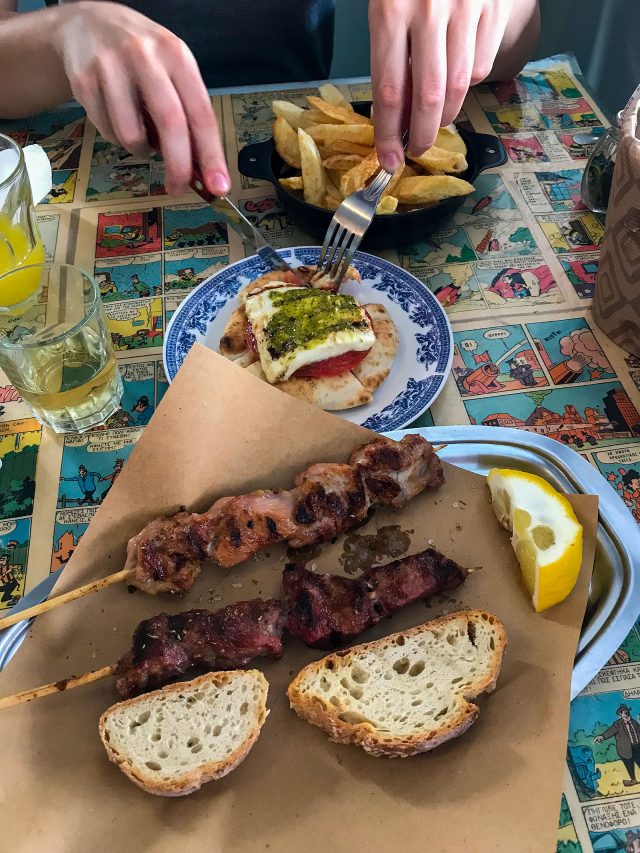 Világutazó gasztro tipp: Természetesen kihagyhatatlan az igazi görög gyros, amiből igazán jót ehetünk – rendkívül olcsón – a Monastiraki tér sarkán található Bairaktaris étteremben, de ugyanitt kérhetjük a klasszikus „sétálós” változatot, elvitelre is. A másik ajánlatunk pedig a szuvláki. A magyar rablóhúsra hasonlító görög változat mellé mozzarella, paradicsom és pita is dukál, de a Kalamakeri nevű kis étteremben tucatnyi más körítés is választható. A kedves kiszolgálás és a barátságos árak mellett nem okozott meglepetést, hogy itt is örömmel fogadták a bankkártyás fizetést. Görög kávé? Azt inkább ne – szerintünk -, de a freddo capuccinot melegen ajánljuk! Akarom mondani, hidegen. Ha azt kérdezzük magunkban, hogy vajon mi lehet az a habos kávékülönlegesség, amit minden görög és nem görög reggel, délben és este fogyaszt a helyi kávézókban és kiülős teraszokon, akkor a válasz egyértelműen: freddo capuccino