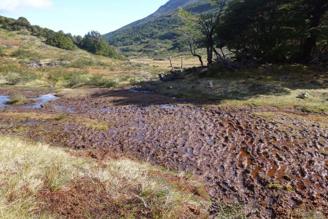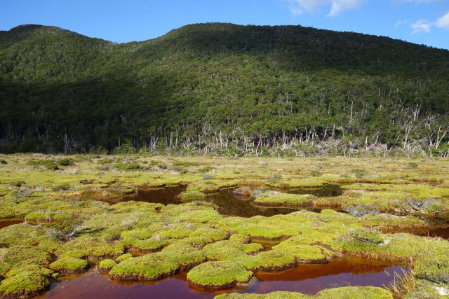 A túra következő része egy kb. két órás laza séta volt a sík, mocsaras vidéken. Az ún. Azorellákon lépkedve olyan érzésünk támadt, mintha egy hatalmas gumiszőnyegen gyalogolnánk. A furcsa, vörös színű, nem tudni, hogy milyen mély pocsolyákat kerülgettük, közben rengeteg apró harmatfű díszítette a tájat. Az irányt (ami szinte csak egyenes volt) földbe szúrt karók mutatták.