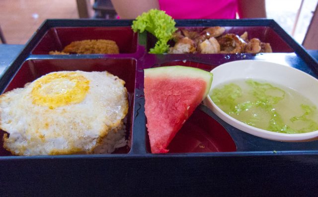 Miután bebarangoltuk a mólókat (is), úgy döntöttünk (kedves feleségem), hogy itt az ideje a prioritások felülvizsgálatának és stratégiai döntést hoztunk (hozott). Ebéd. Annak ellenére, hogy az ebédidő vége felé jártunk, a helyi kifőzdék többsége már (vagy még) nem volt nyitva. Több helyi étterem kínálatát átnézve végül egy kínainak látszó beülős étterembe rendeltünk. A bento box, hasonlóan, mint mindenhol máshol finom volt. Az egyetlen különlegesség a szelet dinnye volt, amit korábban nem kaptunk még ilyen kiszereléshez. A másik rendelt étel viszont minden képzeletet felülmúló volt. Csirke falatok csilis szósszal és tojásos, párolt-sült rizzsel. Még sosem ettem ilyen finom rizst! Mellé mango shake, ami kellően hűsítő volt a meleg párás időben. Foodie örültek nem fognak csalódni!!