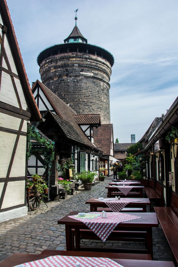 A fő pályaudvarral szemben áll a nürnbergi városfal négy fő tornyának egyike, a 14. század végén épült Frauentorturm. Átsétálva a várkapun a macskaköves utcában mintha csak egy kis középkori minivárosban találnád magad, ami nem más mint a kézműves udvar (Handwerkerhof Alt Nürnberg), ahol a fagerendás házakban a helyi hagyományos kézműves műhelyeket és portékáikat találod, legyen szó bőráruról, a fa és ón játékokról, üvegfestésről vagy fazekas termékekről. Mint egy kis oázis a városban, itt rögtön megüti az orrod a nürnbergi mézeskalács, a sült kolbász és a többi finomság illata.
