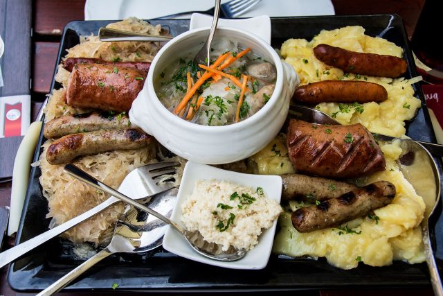 Persze nem lenne teljes a Nürnbergi óvárosi látogatásunk, ha nem ülnénk be egy jellegzetes bajor vendéglőbe és próbálnák ki a nürnbergi kolbászt, sőt a híres nürnbergi hármas kolbász megízlelését savanyú káposztával és burgonyasalátával.