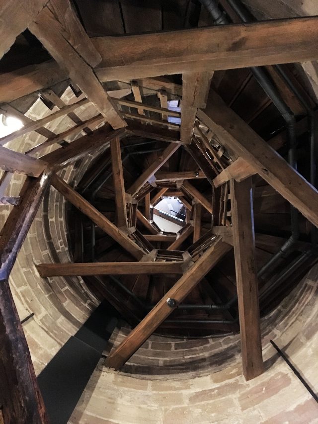 A védelmi célokat szolgáló torony már magasságával is azt sugallta, hogy nem érdemes megtámadni a várost. Felérve, a körpanoráma mellett egy érdekes előtte-utána fotókiállításon azt is megnézhetjük, hogy a második világháborús bombázások során milyen károkat szenvedett a város.