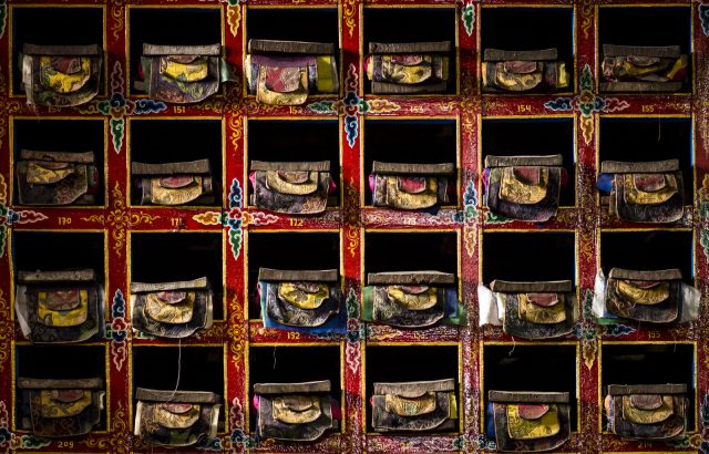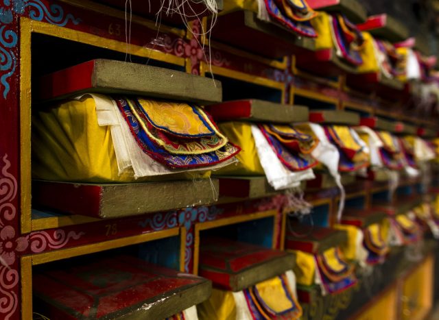 A világos vörös – okker színű kolostorok és templomok mind formájukban, mind méretükben a tibeti mintát követik. Általában két-, ritkábban három emeletes épületek, alaprajzuk a szent mandala dizájnt követi. A kolostorokba és templomokba egy zárt, kővel kirakott előtéren vagy cham-rán keresztül jutunk be. Ezt kell rituálisan megkerülni, mielőtt a fő csarnokba, a lha-khangba lépnénk. A csarnokban a fő helyett a főistennek szentelt oltár foglalja el. A plafonról festett tekercsek, tankák lógnak, az oszlopok tetején selyemzászlók lengenek. A bejárattól általában egy lépcsősor vezet fel az emeletre. Tengboche kolostorában az emeleten találjuk a híres könyvtárat.
